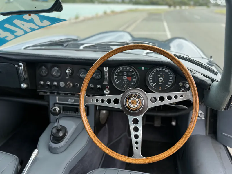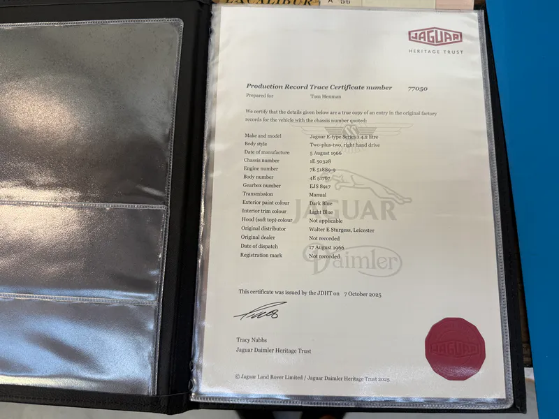 Powered by the torquey 4.2-litre straight-six, mated to the 4 speed manual transmission, the car delivers the refined performance and character expected from a Series 1 Jaguar. The chassis (1E50328) and engine (7E51889-9) correspond correctly, and its known dispatch date—17 August 1966 via Walter E. Sturgess of Leicester—confirms its original UK-market delivery.